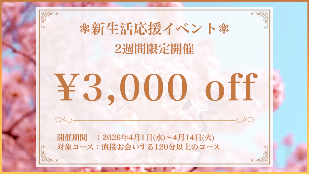 ホームブログ 新生活応援イベントのお知らせ 2026年2月25日 / イベント, 新着情報 バレンタインイベントのお知らせ 2026年1月26日 / イベント, 新着情報 おみくじイベントのお知らせ 2025年12月29日 / イベント, 新着情報 クリスマスイベントのお知らせ 2025年12月1日 / イベント, 新着情報 駅までお見送りキャンペーンのお知らせ 2025年10月18日 / イベント, 新着情報 メッセージコースプレゼントイベントのお知らせ 2025年9月26日 / イベント, 新着情報 百合さんバースデーイベントのお知らせ 2025年9月24日 / イベント, 新着情報 美月さん卒業のお知らせ 2025年9月22日 / 新着情報 2ショット撮影プレゼントイベントのお知らせ 2025年8月25日 / イベント, 新着情報 ふわふわ百合通信 vol.4 2025年7月25日 / キャストブログ, 新着情報 1 2 3 … 8 ›